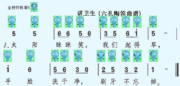 讲卫生-六孔陶笛曲谱,太阳眯眯笑,我们起得早,手脸洗干净,刷牙不忘掉。